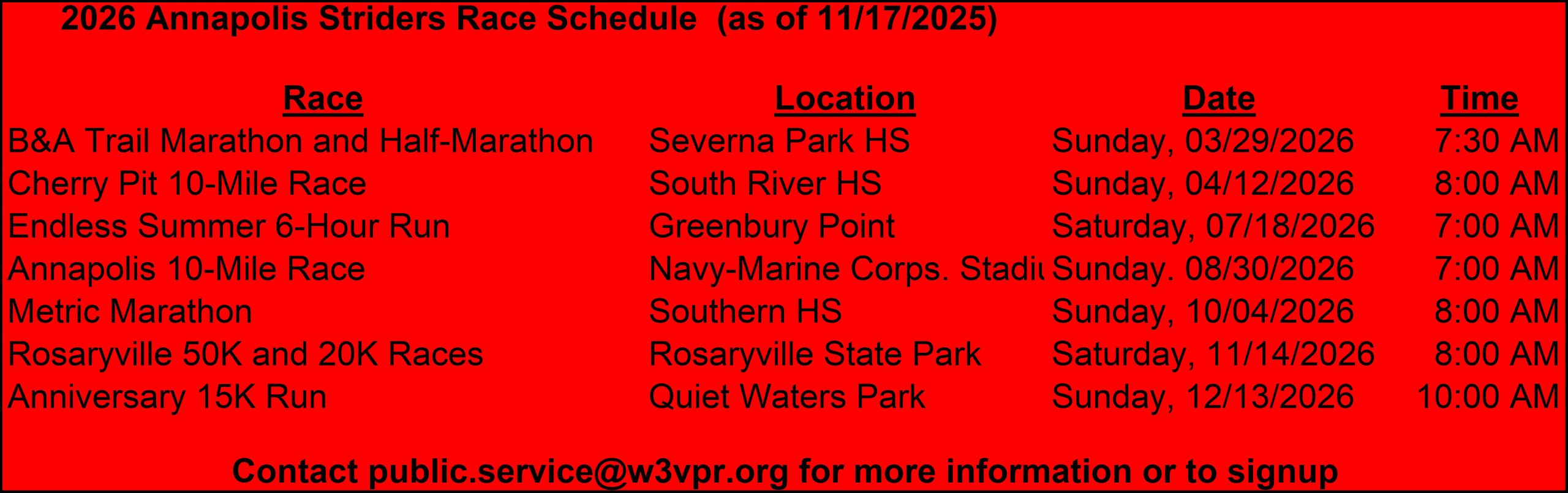 On a yearly basis the Anne Arundel Radio Club and its members assist with communications for a number of events sponsored by The Annapolis Striders. ln the past these have included The B&A Trail Marathon & Half Marathon, The Rosaryville Trail Run, The Endless Summer 6-Mile Run, The Cherry Pit 10 Mile, The Annapolis 10 Mile Run, The Metric Marathon, The Rosaryville Veterans Day 50K and The Cold Turkey 10K. Many volunteer hams are placed at water stops, shadow the race director, staff the network control center, and monitor the crucial turns of the course and first aid stations. This is a good way to practice skills and get experience. Contact Jeff at public.service@w3vpr.org if you would like to assist.